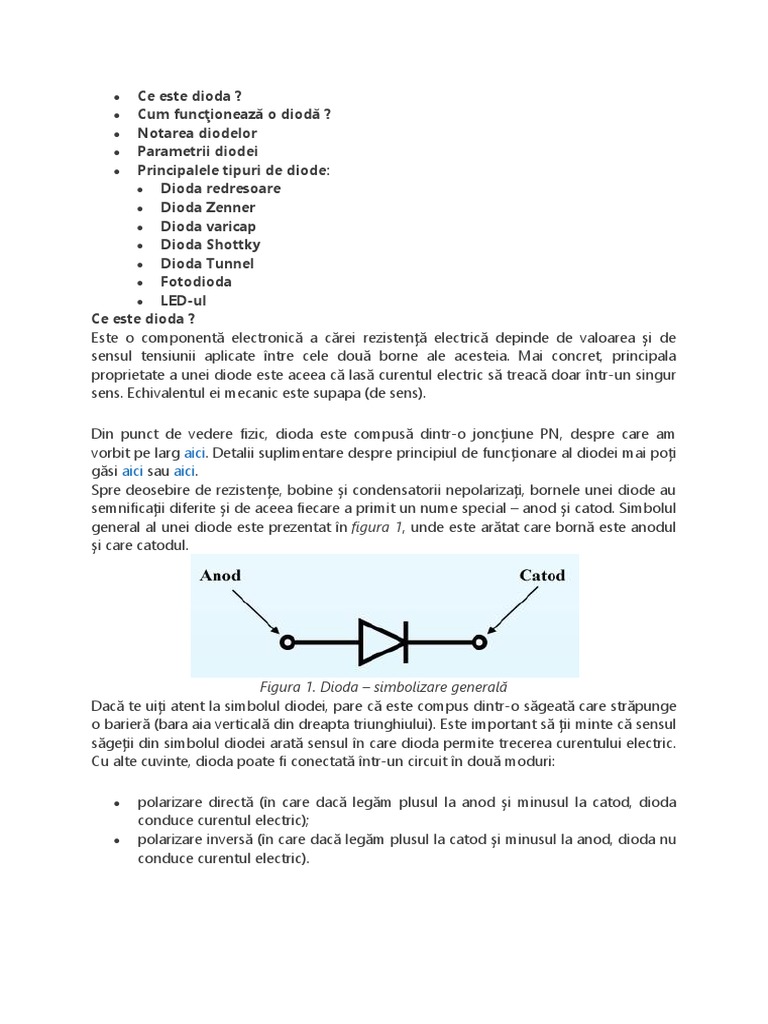 Este o componentă electronică a cărei rezistenţă electrică depinde de valoarea şi de sensul tensiunii aplicate între cele două simbolul general al unei diode este prezentat în figura 1, unde este arătat care bornă este anodul şi care catodul.