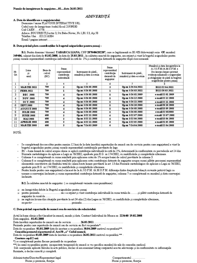 Adeverinta din care rezulta baza lunara de calcul al contributiei individuale la somaj (anexa 26) se completeaza pentru fiecare luna din ultimele 12 2. Date privind plata contribuţiilor la bugetul asigurărilor pentru şomaj anexa nr.14 (anexa nr.26. Documentul eliberat de catre angajator trebuie sa ateste activitatea desfasurata de catre salariat, durata si.